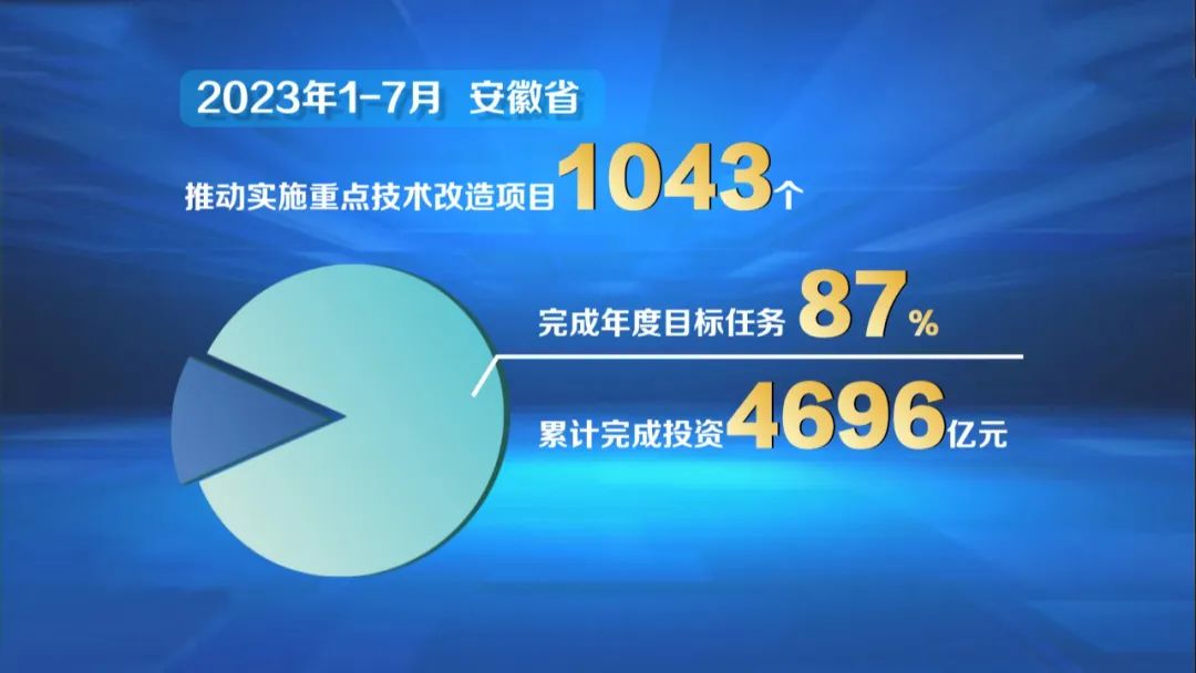 大力实施制造业数字化转型重点工程,加快推进技改项目落地见效。今年1-7月,安徽推动实施重点技术改造项目1043个,完成年度目标任务的87%,累计完成投资4696亿元。