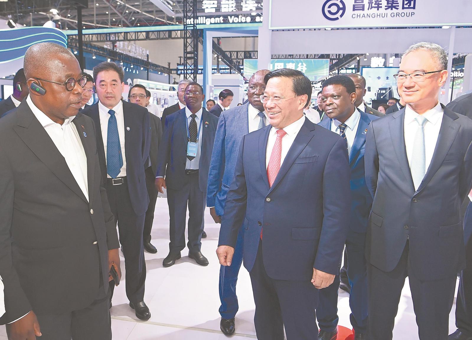 2023世界制造业大会开幕前,9月19日晚,省委书记韩俊,省委副书记、省长王清宪,与出席大会的大会主办、支持单位负责人,国家部委、中央企业负责人,有关国际组织负责人或代表、相关国家大使、总领事、副总领事、希腊阿提卡大区政府团,世界500强、境外跨国公司和知名企业负责人或代表,兄弟省(区、市)负责人,院士专家代表共同考察展馆。记者 杨竹 摄