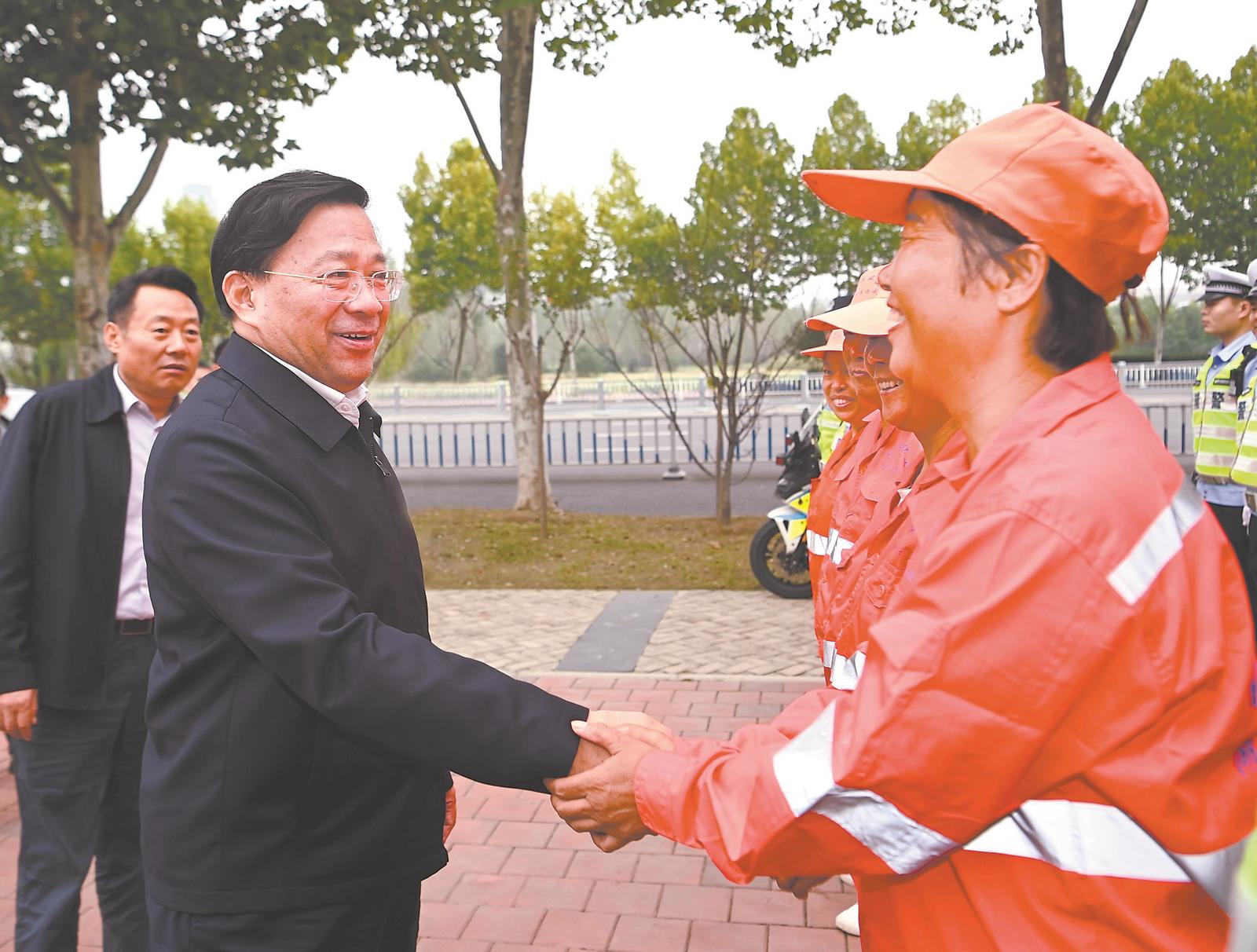 9月28日,省委书记韩俊在合肥市塘西河公园北幸福驿站与一线环卫工人、路面执勤交警、绿化管养人员一一握手,感谢他们为城市建设发展付出的辛劳和汗水,并致以节日祝福。记者 杨竹 摄