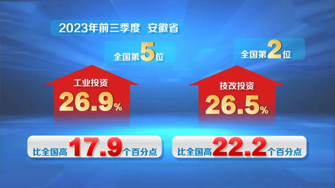 找准产业发力点,以项目为抓手,持续扩大有效投入,安徽工业的增长动能更加强劲。前三季度,全省在建总投资50亿元以上制造业项目共有106个,较上年同期增加53个。在重大项目带动下,工业投资、技改投资同比分别增长26.9%和26.5%,比全国高17.9个和22.2个百分点,分别跃居全国第5位和第2位。