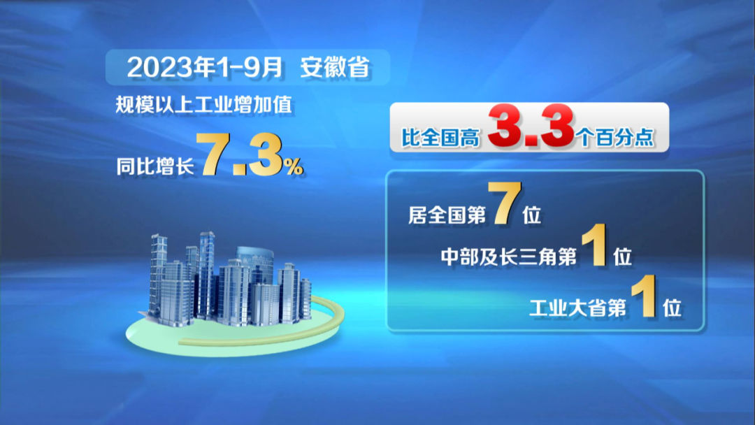 抓产业、抓项目,调结构、促增长,今年以来安徽工业经济运行稳步向好。1-9月,全省规模以上工业增加值同比增长7.3%,比全国高3.3个百分点,居全国第7位、中部及长三角首位、工业大省首位。