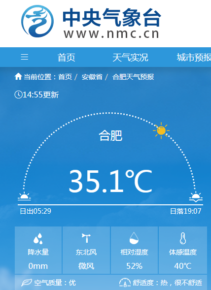 值得一提的是,3日合肥市最高气温为35.8℃。而事实上,由于空气湿度居高不下,市民的实际体感要更为酷热。数据表明,当天14点55分,合肥市实测气温为35.1℃,空气相对湿度为52%,换算成体感温度则高达40℃。