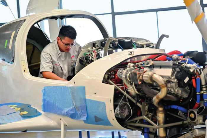 在位于安徽省芜湖市湾沚区的中电科芜湖钻石飞机制造有限公司内,工作人 员在装配一架通航飞机(2025年7月3日摄)张铖 摄