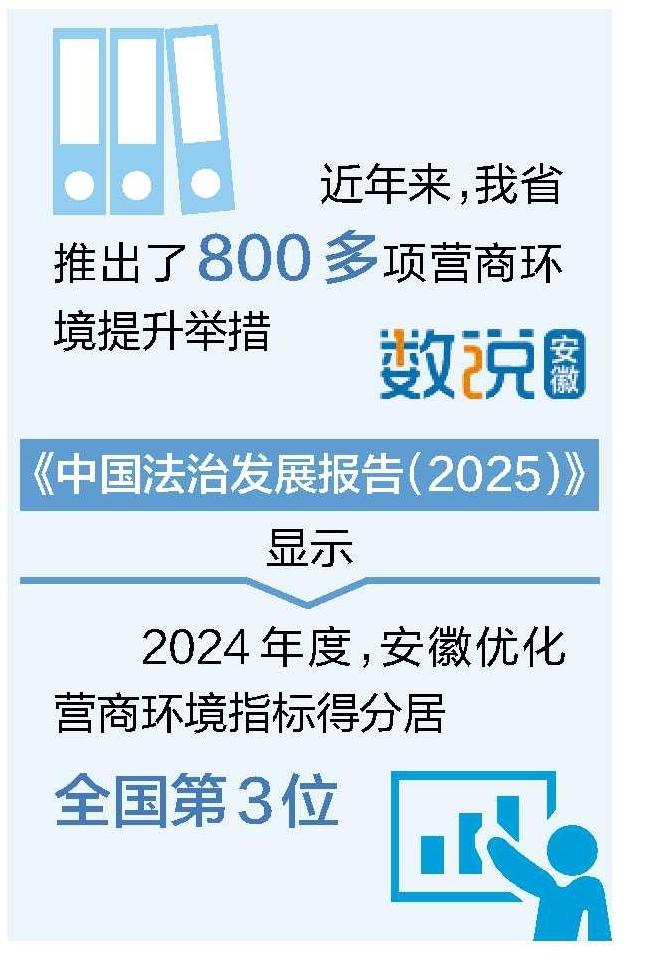 日前发布的《中国法治发展报告(2025)》显示,2024年度,安徽优化营商环境指标得分居全国第3位。