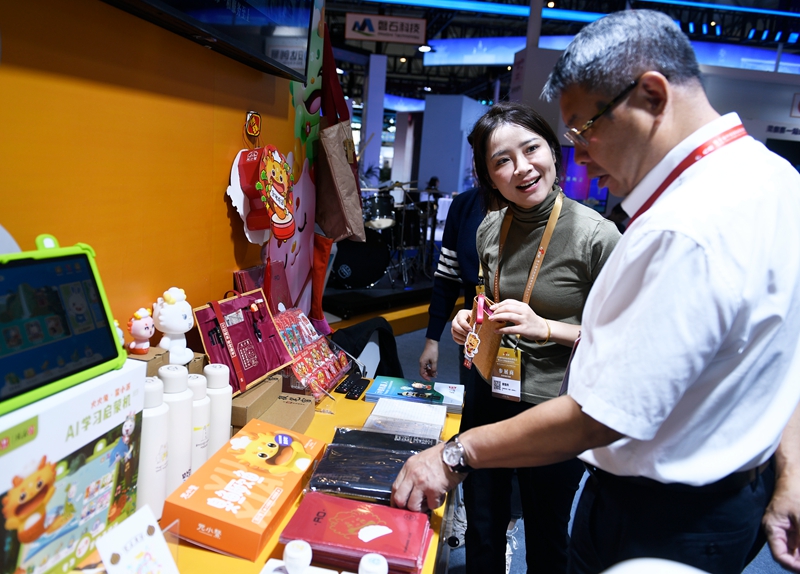 展台现场工作人员蔡雪燕拿起一个“捷报笔帘”介绍:“‘元小鳌’寓意‘独占鳌头’,我们将‘书不畏难’的求索精神融入其中,通过定制图书、文创、学习机、机器人甚至主题乐园,让传统文化以更时尚、更亲切的方式触达青少年。”她说:“从形象落地到商业变现,我们形成了产品集群。‘元小鳌’不仅荣获多项行业大奖,更实现了IP开发与文化事业、产业发展的深度融合。”