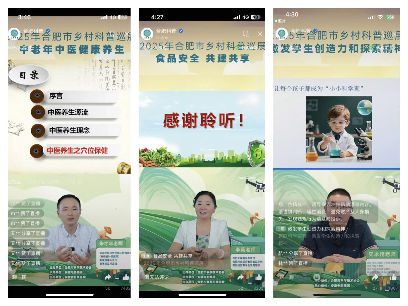 直播拓界,拓展科普服务边界 为打破地域限制、破解线下活动覆盖范围有限的难题,本次巡展创新打造“线上直播+线下巡展”双线并行的科普模式,其中三场线上直播专场成为科普服务的重要延伸与补充,让优质科普资源触达更广泛的人群。直播专场聚焦群众高度关注的热点主题,精心筛选主讲嘉宾,通过“理论讲解+经典案例”的形式,深入解读专业知识、回应网友关切。直播依托“合肥科普”微信公众号搭建便捷观看平台,支持提前预约、实时留言互动与回放重温,有效满足了上班族、偏远乡村群众、行动不便的老年人等线下活动难以覆盖群体的科普需求,构建起“随时随地学科学”的便捷渠道,让科普服务真正突破时空边界。