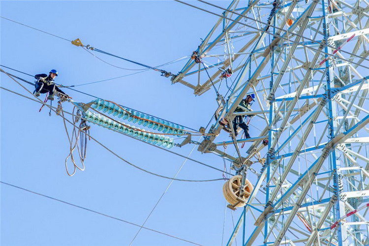 (电力施工人员在淮北市濉溪—凌云220千伏线路N48—N54号铁塔之间开展导地线展放。王磊摄)