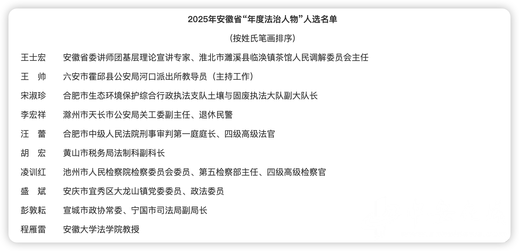 2025年安徽省“年度法治人物”人选名单