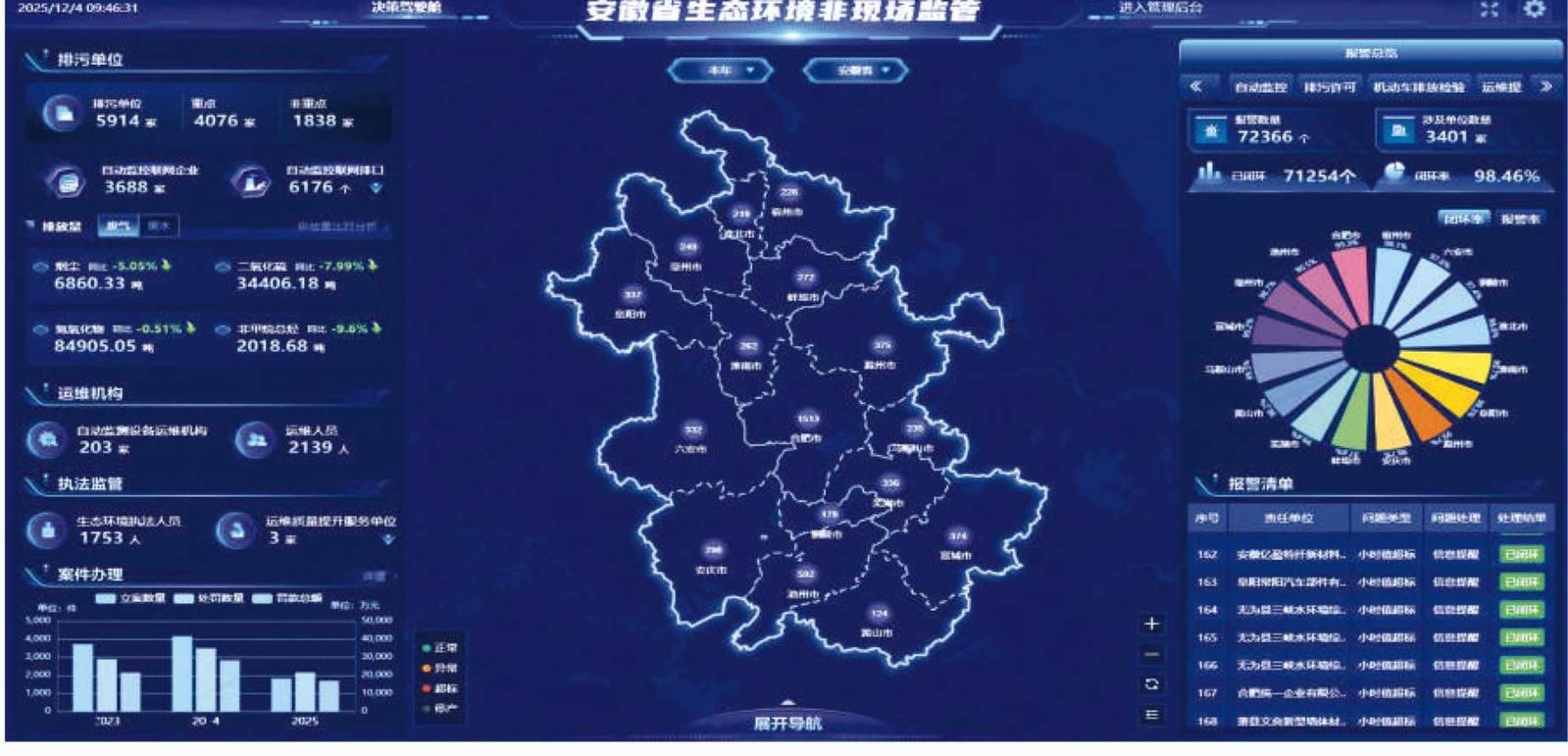 按照“省级统建、市县共用、企业共享”原则,迭代升级安徽省生态环境非现场监管执法平台(2.0版),在“皖政通”“皖企通”双端部署,智能分析预警问题线索,实现了环境监管从被动响应向主动预见、从经验判断向数据研判的转变。