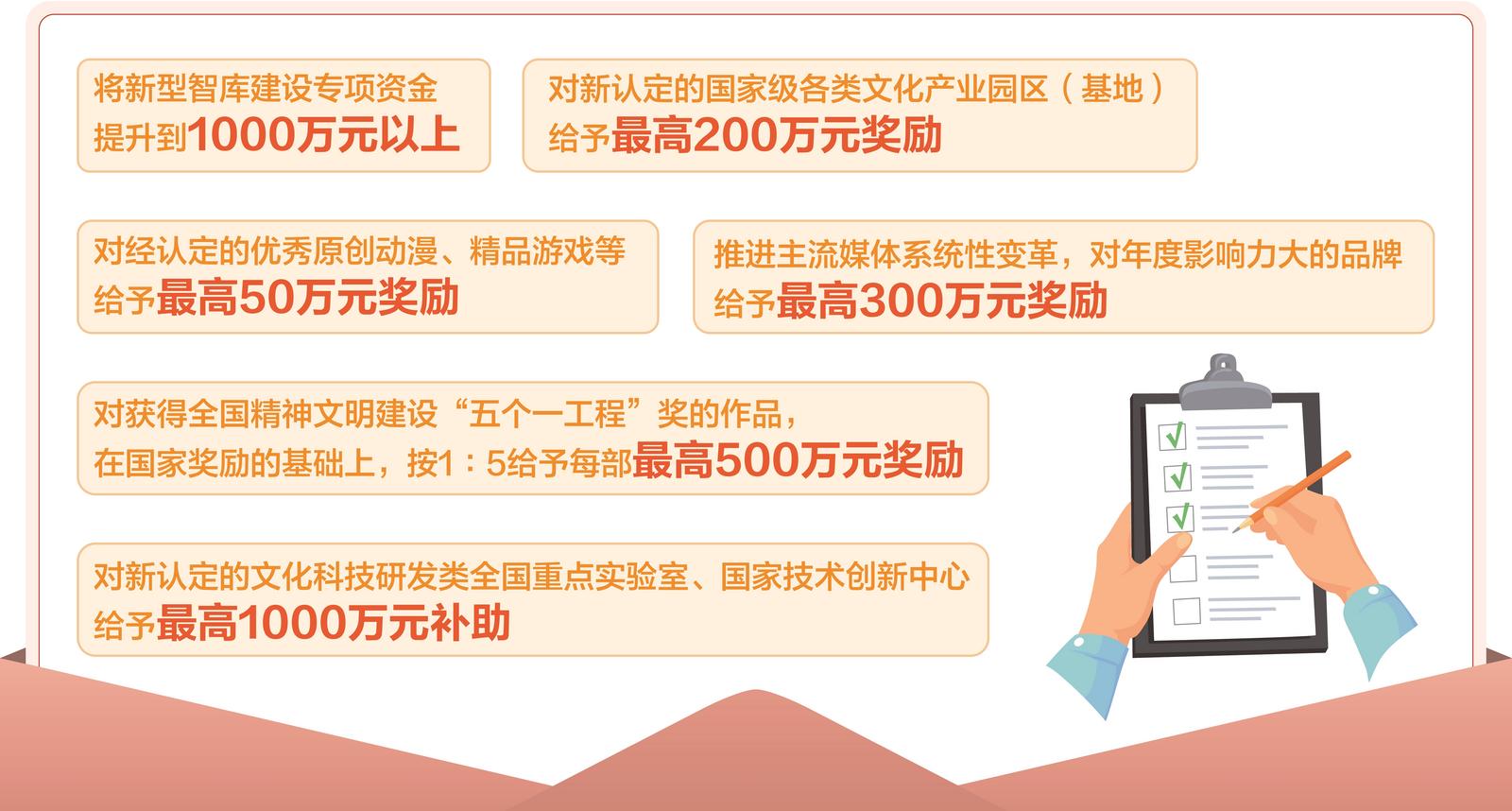 《若干举措》强化资金保障力度,调动社会力量参与文化建设:将新型智库建设专项资金提升到1000万元以上。支持紫云山(包河)文化创意产业园打造全国具有重要影响力的文化创意产业集聚地,对新认定的国家级各类文化产业园区(基地)给予最高200万元奖励。支持发展动漫、游戏、电竞、电音、网络文学、直播电商、数字创意、网络视听等新产业新业态,对经认定的优秀原创动漫、精品游戏等给予最高50万元奖励。推进主流媒体系统性变革,对年度影响力大的品牌,给予最高300万元奖励。对获得全国精神文明建设“五个一工程”奖的作品,在国家奖励的基础上,按1∶5给予每部最高500万元奖励。对新认定的文化科技研发类全国重点实验室、国家技术创新中心,给予最高1000万元补助。