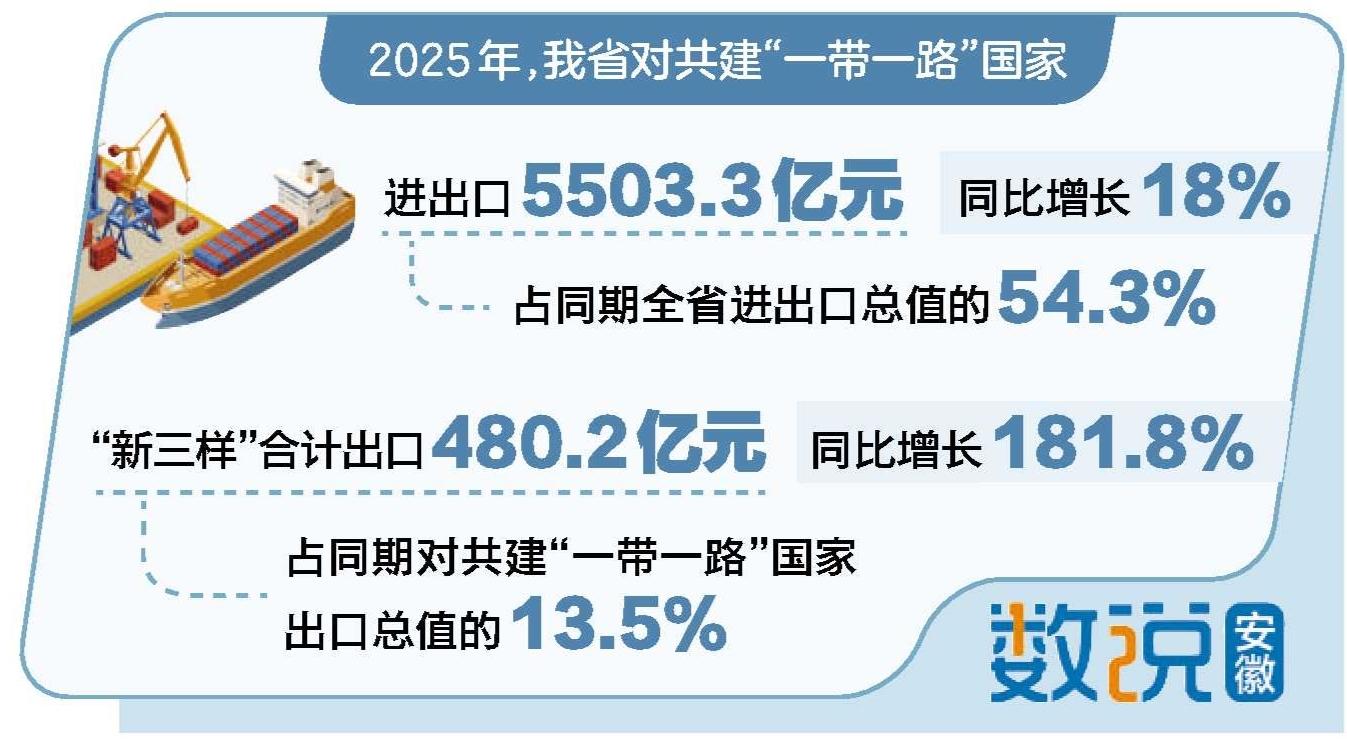 越来越多的皖企将“出海”目光投向共建“一带一路”国家。数据显示,2025年,安徽省对共建“一带一路”国家进出口5503.3亿元,同比增长18%,占同期安徽省进出口总值的54.3%。其中,出口3553亿元,同比增长15%;进口1950.3亿元,同比增长24.1%。