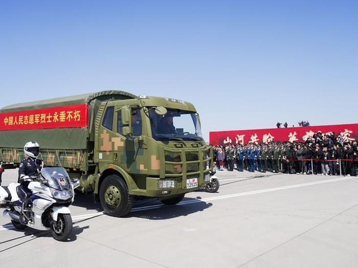 载有12位志愿军烈士遗骸棺椁及相关遗物的军车车队,在70辆摩托车组成的骑警护卫队的开道护送下,从仪式现场出发,依次离开桃仙机场,前往沈阳抗美援朝烈士陵园。