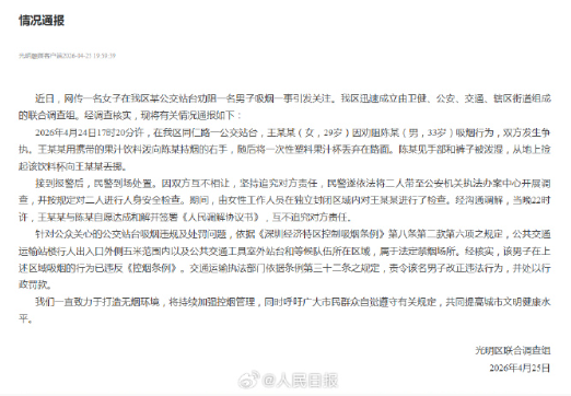 深圳光明区联合调查组通报:近日,网传一名女子在我区某公交站台劝阻一名男子吸烟一事引发关注。我区迅速成立由卫健、公安、交通、辖区街道组成的联合调查组。经调查核实,现将有关情况通报如下: