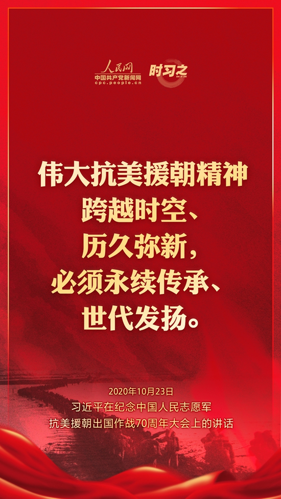 10月23日上午10时,纪念中国人民志愿军抗美援朝出国作战70周年大会在北京人民大会堂隆重举行。中共中央总书记、国家主席、中央军委主席习近平出席大会并发表重要讲话。在讲话中,习近平总书记全面回顾总结了抗美援朝战争的伟大胜利和巨大贡献,深刻阐述了抗美援朝精神的历史意义和时代价值,精辟揭示了抗美援朝战争的历史启示,郑重宣示了捍卫国家领土主权和统一、维护地区和世界和平稳定、推动构建人类命运共同体的坚定立场和决心,强调要铭记伟大胜利,敢于斗争、善于斗争,把中国特色社会主义伟大事业不断推向前进。人民网·中国共产党新闻网“时习之”栏目制作了12张海报,带您一起回顾总书记铿锵有力的话语。