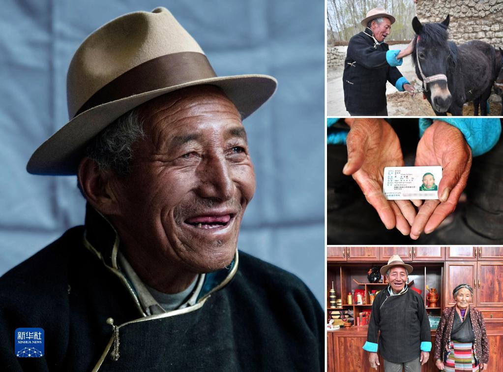 拼版照片。左:多布杰老人的肖像;右上:多布杰老人在照顾家里的马匹;右中:多布杰老人的身份证;右下:多布杰老人(左)和老伴普布潘多在班久伦布村的家里(5月10日摄)。新华社记者 孙瑞博 摄