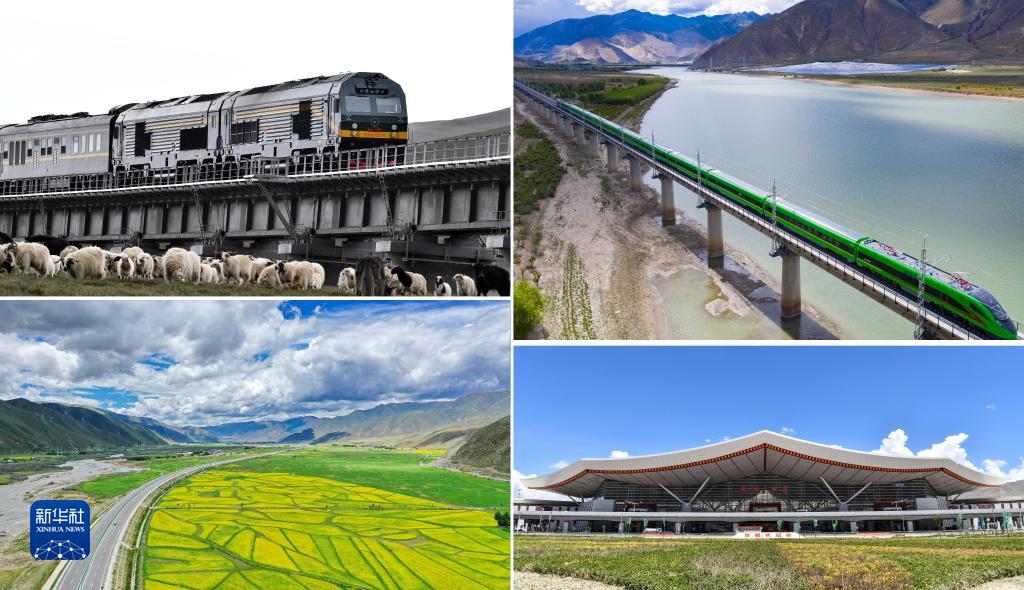 拼版照片。左上:2019年6月10日拍摄的青藏铁路上行驶的列车(新华社记者觉果摄);右上:2021年6月16日,试运行的复兴号列车从雅鲁藏布江边驶过(新华社记者普布扎西摄,无人机照片);左下:2019年7月16日拍摄的拉林公路沿线油菜花和青稞地(新华社记者张汝锋摄,无人机照片);右下:2021年6月30日拍摄的拉萨贡嘎国际机场T3航站楼外景(新华社记者晋美多吉摄)。新华社发