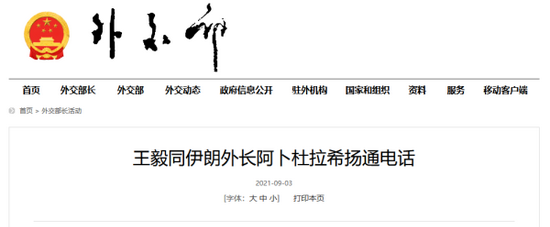 外交部网站9月3日消息:2021年9月3日,国务委员兼外长王毅同伊朗新任外长阿卜杜拉希扬通电话。