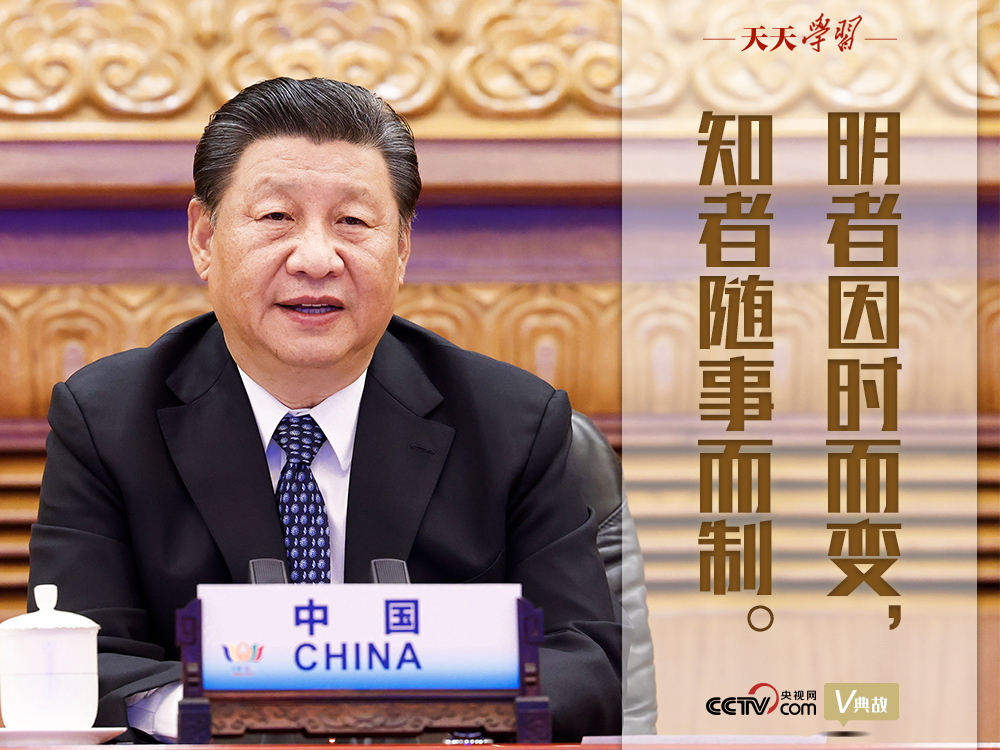 “明者因时而变,知(zhì,古同‘智’)者随事而制”出自西汉桓宽的《盐铁论》,习近平将原文中的“随世而制”化用为“随事而制”。意思是,聪明的人会随着时代的变化而改变策略,有智慧的人会按照世事变化的情况而制定法则。这句话强调了“变”的重要性和必要性,主张与时俱进,积极地根据时代发展要求做出适当的调整,反对因循守旧。