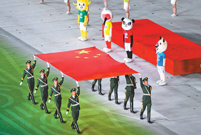 20时,仪仗队员护拥五星红旗健步走入体育场。会旗方阵过后,各代表团依次入场,此起彼伏的欢呼、自信阳光的笑容,在体育场中飞扬。