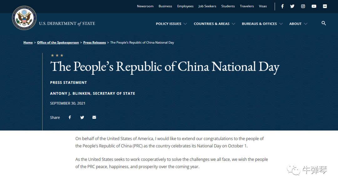当然,看了一下,国务卿先生的祝贺,发在了政府网站上。他的推特没有发。嗯,社交媒体上没有发的,真心都要打点折扣,我们心知肚明就好。