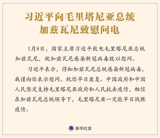 新华社北京1月8日电 1月8日,国家主席习近平致电毛里塔尼亚总统加兹瓦尼,就加兹瓦尼感染新冠病毒致以慰问。