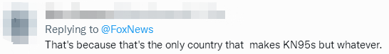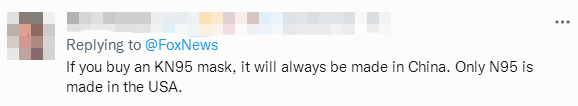 在福克斯新闻将这篇报道发在社交媒体推特上后,虽然有一些美国网民跟着起哄“让中国制造离开美国”,但还是有许多网民点出“真相”:在美国还有更多的“中国制造”,美国离不开制造的KN95口罩。↓