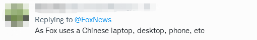 还有人讽刺报道这一新闻的福克斯新闻说:“福克斯使用的也是中国造笔记本电脑、台式机、手机等等。”↓