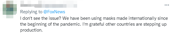另一名网友则表示:“我没看到这有什么问题?自疫情开始以来,我们一直在使用国际上(其他国家)制造的口罩。(相反)我很感激其他国家正在加紧生产(口罩)。”