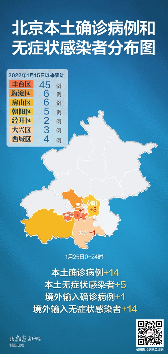 1月25日0时至24时,北京新增14例本土确诊病例(确诊病例1至12昨日均已通报)和5例无症状感染者(无症状感染者1至3昨日均已通报)。截至目前,北京本土感染者已达71例。