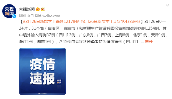 3月26日0—24时,31个省(自治区、直辖市)和新疆生产建设兵团报告新增确诊病例1254例。其中境外输入病例37例(四川12例,广东8例,广西7例,上海6例,北京1例,天津1例,浙江1例,湖南1例),含15例由无症状感染者转为确诊病例(四川11例,天津1例,浙江1例,湖南1例,广东1例);本土病例1217例(吉林1071例,其中长春市633例、吉林市434例、四平市4例;上海47例,其中闵行区15例、嘉定区9例、宝山区6例、徐汇区5例、静安区3例、浦东新区3例、长宁区2例、杨浦区2例、普陀区1例、虹口区1例;辽宁28例,其中沈阳市16例、营口市7例、鞍山市2例、大连市1例、铁岭市1例、葫芦岛市1例;天津16例,其中河北区6例、东丽区3例、西青区3例、河东区2例、南开区1例、北辰区1例;河南14例,其中周口市13例、洛阳市1例;河北10例,其中唐山市5例、廊坊市5例;黑龙江8例,其中哈尔滨市7例、绥化市1例;山东5例,其中滨州市4例、威海市1例;湖南4例,其中长沙市2例、怀化市2例;安徽2例,均在芜湖市;江西2例,均在南昌市;广东2例,其中茂名市1例、汕尾市1例;甘肃2例,其中兰州市1例、天水市1例;北京1例,在通州区;江苏1例,在泰州市;浙江1例,在湖州市;福建1例,在泉州市;云南1例,在德宏傣族景颇族自治州;陕西1例,在安康市),含124例由无症状感染者转为确诊病例(吉林103例,天津6例,河北6例,辽宁4例,上海2例,江西1例,山东1例,甘肃1例)。无新增死亡病例。无新增疑似病例。