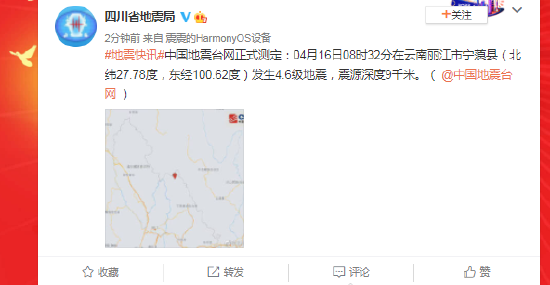 中国地震台网正式测定:04月16日08时32分在云南丽江市宁蒗县(北纬27.78度,东经100.62度)发生4.6级地震,震源深度9千米。