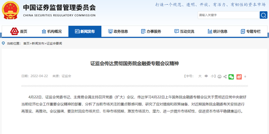 4月22日,证监会党委书记、主席易会满主持召开党委(扩大)会议,传达学习4月22日上午国务院金融委专题会议关于贯彻近日党中央做好当前经济社会工作重要会议精神的部署,分析了当前市场关注的重点敏感问题,研究了应对措施和政策储备,对近期国务院金融委有关安排进行再落实、再推动。