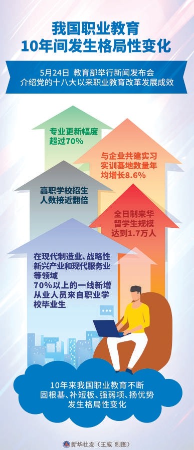 据新华社北京5月24日电(记者 徐壮)专业更新幅度超过70%、与企业共建实习实训基地数量年均增长8.6%、高职学校招生人数接近翻倍、全日制来华留学生规模达到1.7万人……数据显示,10年来我国职业教育不断固根基、补短板、强弱项、扬优势,发生格局性变化。