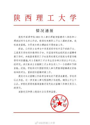 据@陕西理工大学 官方微博6月6日通报,该校外国语学院2022年人事代理教师招聘进入体检和心理测试环节名单公示后,收到有关教职工子女入围的反映。该校立即成立联合调查组开展核查工作。