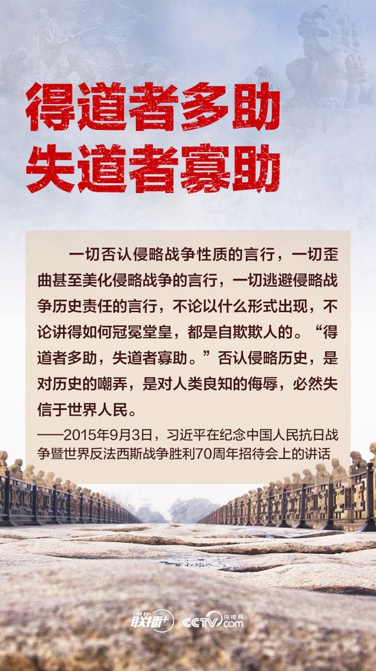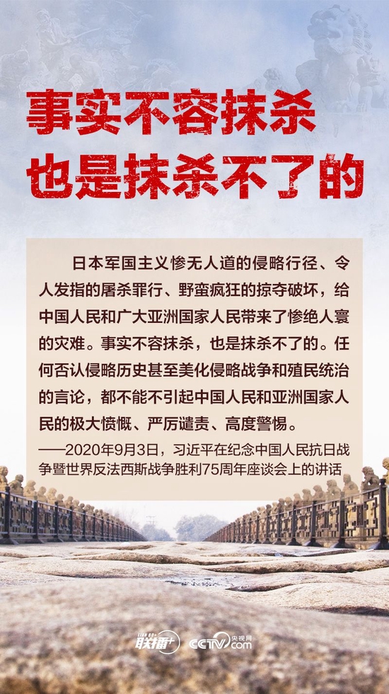 历史无法重来,未来可以开创。在全民族抗战爆发85周年之际,央视网《联播+》特撷取习近平总书记关于坚决反击美化侵略战争的重要论述,邀您一起学习领悟。