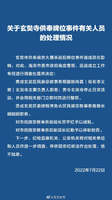 7月22日下午,南京市委宣传部新闻发布官方微博“南京发布”公布了“南京玄奘寺供奉日本战犯牌位事件”的处理情况,责令玄奘寺停止日常活动,并会同相关部门立即对其进行整顿,并对玄奘寺主要负责人、南京市民族宗教事务局负责人、玄武区民族宗教事务局负责人等4人分别予以撤职、免职、诫勉、停职检查等处分。同时,南京市玄武区玄武门派出所工作人员称,已对疑似设立战犯牌位的“吴啊萍”开展身份核实工作,后续调查情况以官方通报为准。