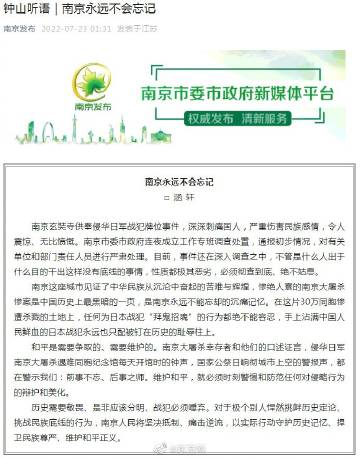 7月22日,侵华日军南京大屠杀遇难同胞纪念馆官方微博回应称:“我们任何时候都不能忘记侵略者所犯下的严重罪行!民族感情不容伤害,期待一查到底!”南京民间抗战博物馆官方微信也发表了谴责,呼吁大家以清醒的历史态度共同维护南京城的历史尊严。
