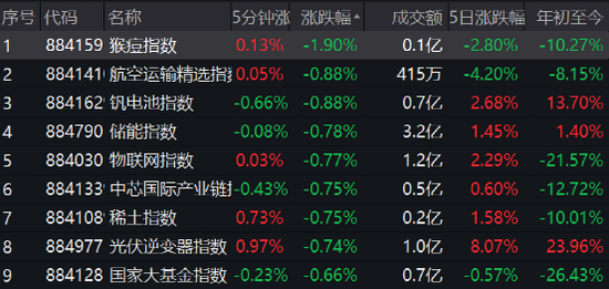 概念板块上,猴痘、储能等概念指数纷纷走弱;光刻胶、消费电子、贵金属等板块走强。