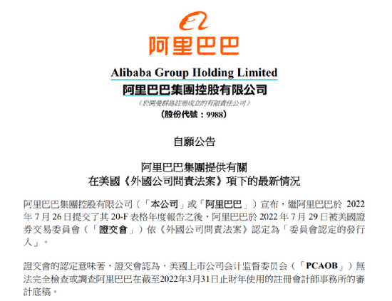 阿里巴巴公布,继2022年7月26日提交了其20-F表格年度报告之后,阿里巴巴于2022年7月29日被美国证券交易委员会依《外国公司问责法案》认定为“委员会认定的发行人”。