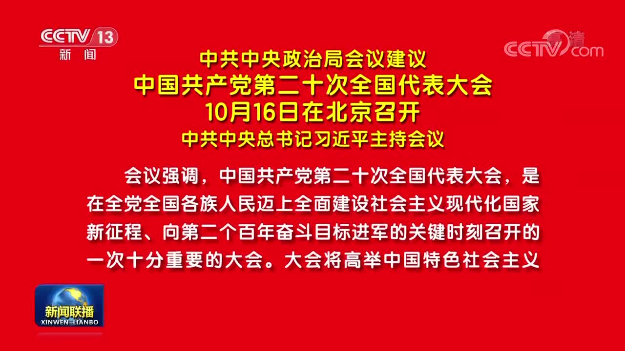 会议决定,中国共产党第十九届中央委员会第七次全体会议于2022年10月9日在北京召开。中共中央政治局将向党的十九届七中全会建议,中国共产党第二十次全国代表大会于2022年10月16日在北京召开。