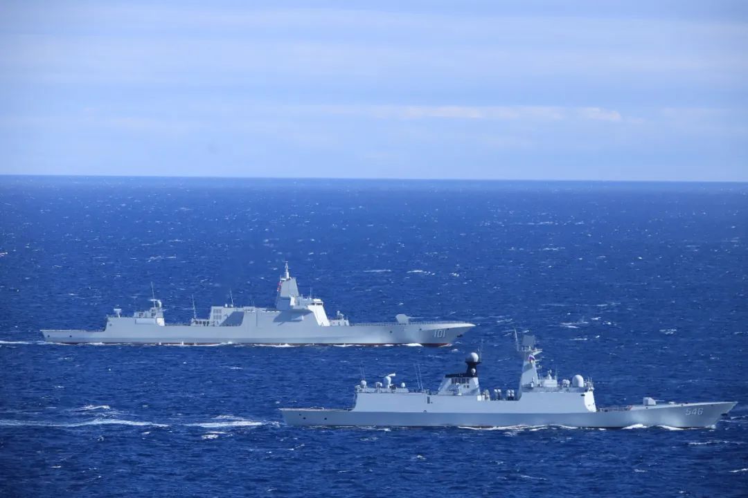 在日本海相关海域,由南昌舰、盐城舰、东平湖舰组成的中方舰艇编队组织对空实弹射击演练。南昌舰使用副炮射击,成功击毁数千米外的靶标。