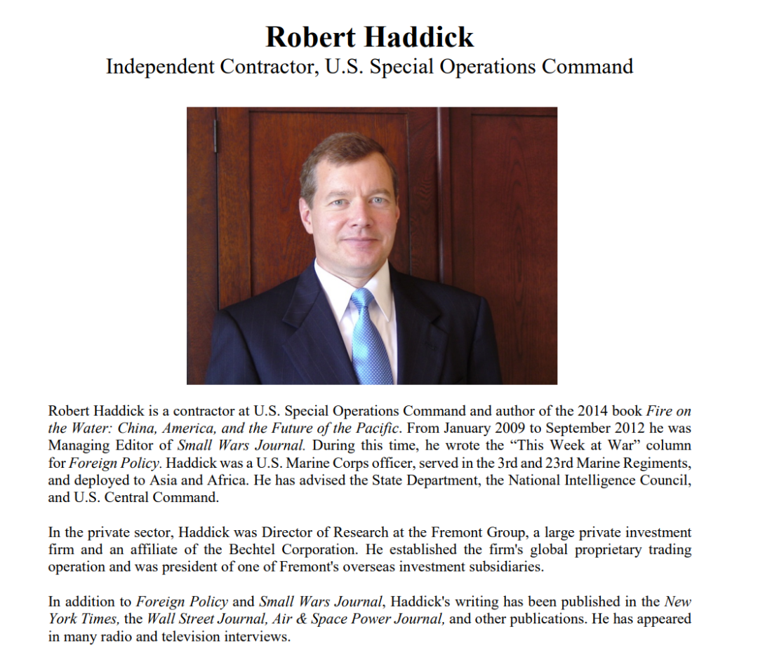 根据美国政府的官方资料,哈迪克曾是美国海军陆战队的一名军官,在亚洲和非洲服过役,退伍后在私企做投资,同时还是美军特种作战司令部的独立合同商。他还为美国国务院、国家情报委员会以及美军中央司令部担任过顾问,在一些军事领域的智库和研究所担任研究员,并出版过专门讲述中美海战的书籍等等,可谓阅历十分丰富。