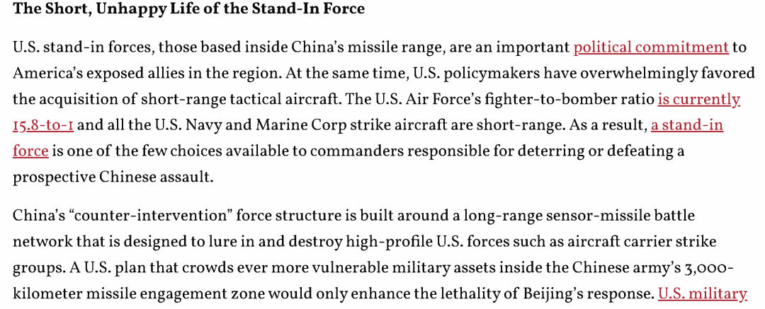 他指出,虽然将美军部署在中国的导弹覆盖范畴对美国的盟友来说有重要的“政治意义”,而且由于美军的决策者更倾向于购买战斗机这种短程战术飞机,战斗机与轰炸机这种远程战术飞机的比例更是大到了15.8比1,所以“内线部队”这种军事部署看起来似乎是应对中国的一种选择;可一旦中美真开打,哈迪克认为,这种部署等于是在给中国的导弹“送人头”,只会进一步展现出解放军打击能力的致命性。