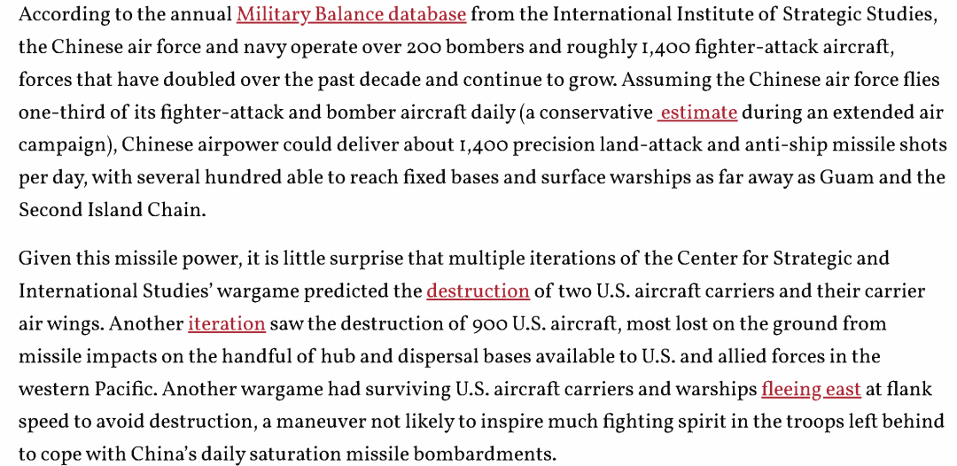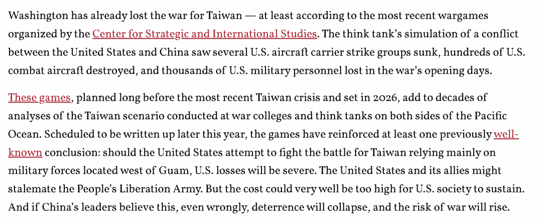 哈迪克甚至在他文章的第一段就直白地表示华盛顿已经输掉了台海的战争,因为根据美国知名智库“国际战略研究中心”的推演,在战争爆发的前几天里,美军就会失去多个航母战斗群,上百架战斗机,以及成千上万的士兵。