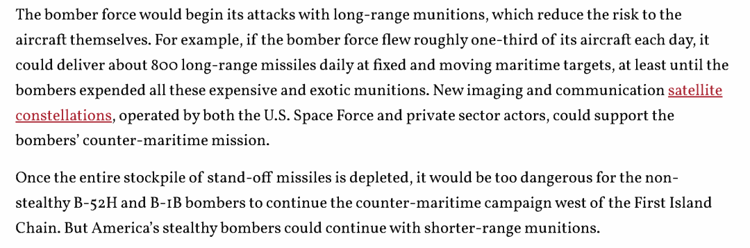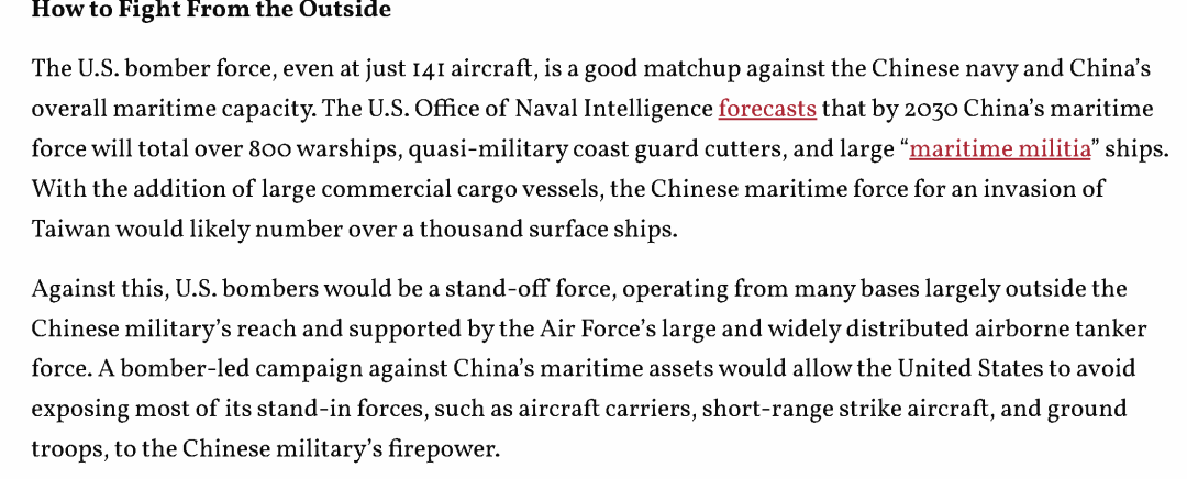 由此,哈迪克在文章的后半部分提出了他认为能“克制”解放军的战术。他提出美军倘若真与中国在台海开战,应该以部署在中国军事力量覆盖面之外的“外线部队”为主力,先出动不在中国导弹打击范围的美军基地里的B-52H和B-1B轰炸机,搭配上美军的空中加油机,在中国火力的外线用远程导弹优先打击中国的海军目标,然后再用隐形轰炸机进入中国的火力覆盖区实施近距离轰炸。