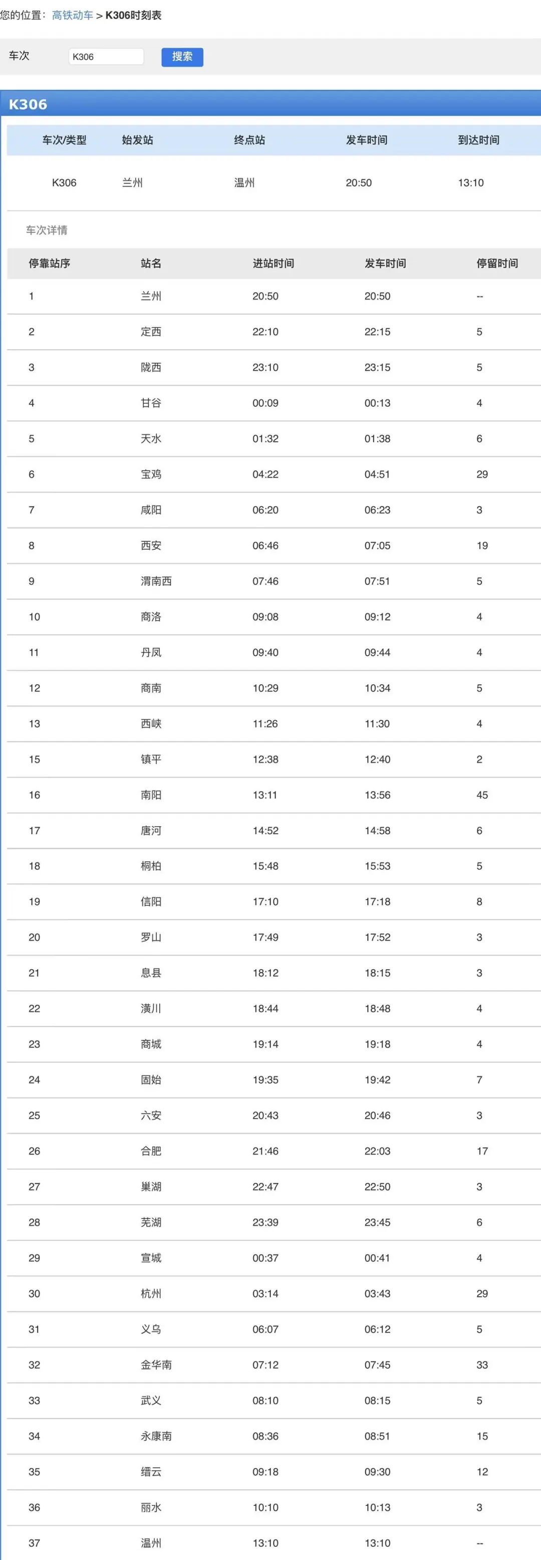 K306/K307列车由兰州站始发,终到温州站,运行时间40小时20分钟,途经兰州、天水、南阳、合肥、杭州、温州等36站。