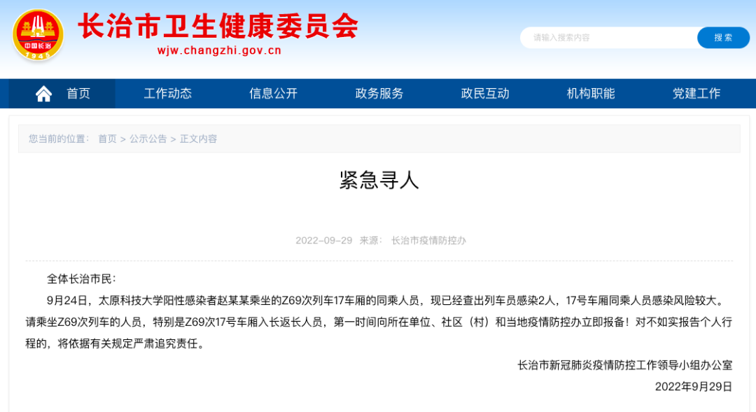 9月29日,山西长治市新冠肺炎疫情防控工作领导小组办公室发布通告称,9月24日,太原科技大学阳性感染者赵某某乘坐的Z69次列车17车厢的同乘人员,现已经查出列车员感染2人,17号车厢同乘人员感染风险较大。