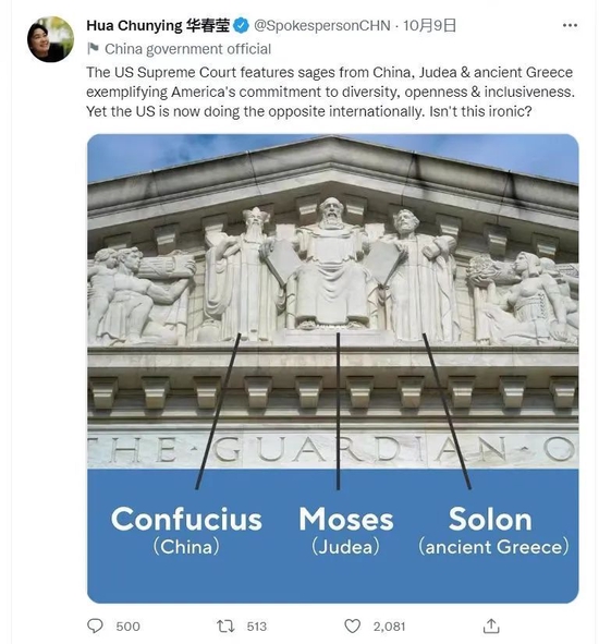 中国外交部部长助理华春莹日前在社交媒体推特发文指出,美国最高法院门楣上雕刻了来自中国、犹地亚和古希腊的先贤形象,以彰显其多元、开放、包容的精神。然而,美国现在在国际上却在做相反的事情。
