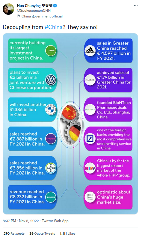 德国总理朔尔茨任内首次访华,为两国合作注入新动力。11月5日晚,中国外交部部长助理、发言人华春莹在推特上发表图文讲述德国企业与中国的合作,犀利反击了所谓对华“脱钩”的杂音。