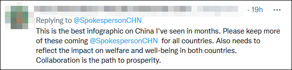 还有人表示,“这是我几个月来看到过最好的有关中国的信息图表,希望能看到中国与更多国家类似的图表。我认为还需要反映出(合作)对彼此国家福利和民众幸福带来的影响。合作才是通向繁荣之路。”